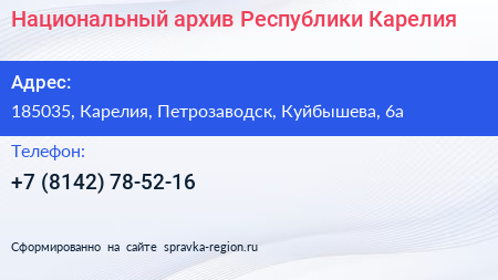 Национальный архив Республики Карелия по адресу 185035, Карелия, Петрозаводск, Куйбышева, 6а в дальнейшем Организация, размещена в следующих категориях: