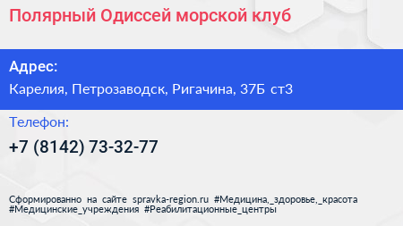 Полярный Одиссей, морской клуб по адресу Карелия, Петрозаводск, Ригачина, 37Б ст3 в дальнейшем Организация, размещена в следующих категориях: