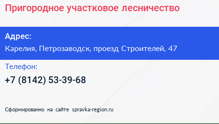 Пригородное участковое лесничество по адресу Карелия, Петрозаводск, проезд Строителей, 47 в дальнейшем Организация, размещена в следующих категориях: