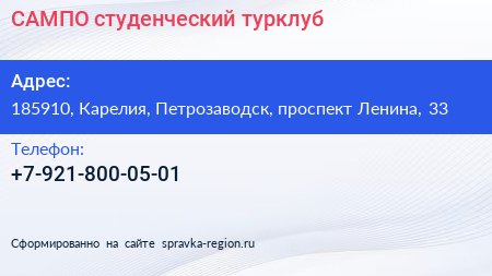 САМПО, студенческий турклуб по адресу 185910, Карелия, Петрозаводск, проспект Ленина, 33 в дальнейшем Организация, размещена в следующих категориях: