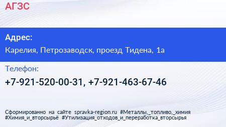 АГЗС по адресу Карелия, Петрозаводск, проезд Тидена, 1а в дальнейшем Организация, размещена в следующих категориях: