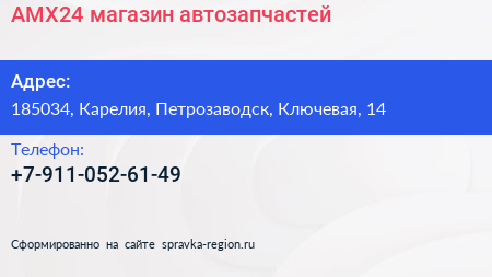 AMX24, магазин автозапчастей по адресу 185034, Карелия, Петрозаводск, Ключевая, 14 в дальнейшем Организация, размещена в следующих категориях: