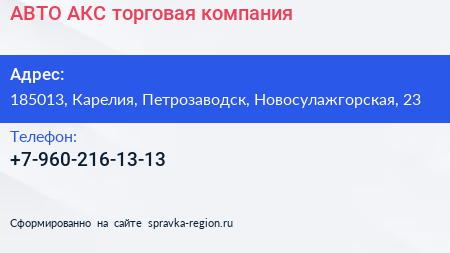 АВТО-АКС, торговая компания по адресу 185013, Карелия, Петрозаводск, Новосулажгорская, 23 в дальнейшем Организация, размещена в следующих категориях: