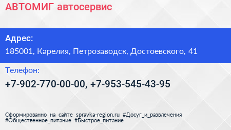 АВТОМИГ, автосервис по адресу 185001, Карелия, Петрозаводск, Достоевского, 41 в дальнейшем Организация, размещена в следующих категориях: