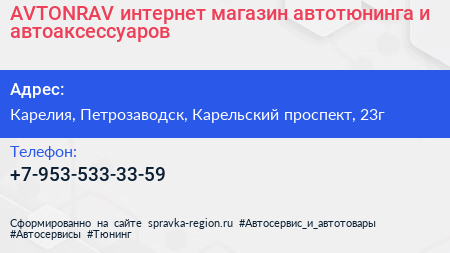 AVTONRAV, интернет-магазин автотюнинга и автоаксессуаров по адресу Карелия, Петрозаводск, Карельский проспект, 23г в дальнейшем Организация, размещена в следующих категориях: