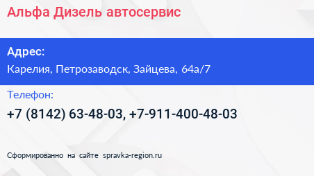 Альфа Дизель, автосервис по адресу Карелия, Петрозаводск, Зайцева, 64а/7 в дальнейшем Организация, размещена в следующих категориях: