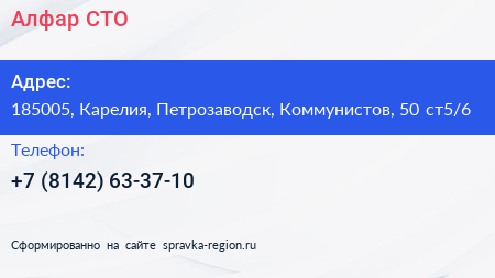 Алфар, СТО по адресу 185005, Карелия, Петрозаводск, Коммунистов, 50 ст5/6 в дальнейшем Организация, размещена в следующих категориях: