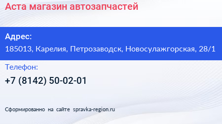 Аста, магазин автозапчастей по адресу 185013, Карелия, Петрозаводск, Новосулажгорская, 28/1 в дальнейшем Организация, размещена в следующих категориях: