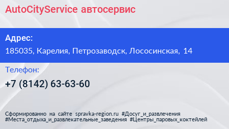AutoCityService, автосервис по адресу 185035, Карелия, Петрозаводск, Лососинская, 14 в дальнейшем Организация, размещена в следующих категориях:
