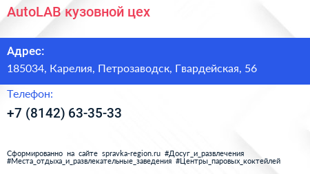 AutoLAB, кузовной цех по адресу 185034, Карелия, Петрозаводск, Гвардейская, 56 в дальнейшем Организация, размещена в следующих категориях: