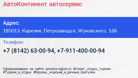 АвтоКонтинент, автосервис по адресу 185013, Карелия, Петрозаводск, Жуковского, 16Б в дальнейшем Организация, размещена в следующих категориях: