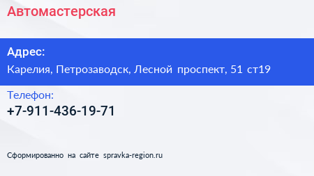 Автомастерская по адресу Карелия, Петрозаводск, Лесной проспект, 51 ст19 в дальнейшем Организация, размещена в следующих категориях: