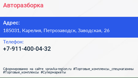 Авторазборка по адресу 185031, Карелия, Петрозаводск, Заводская, 26 в дальнейшем Организация, размещена в следующих категориях: