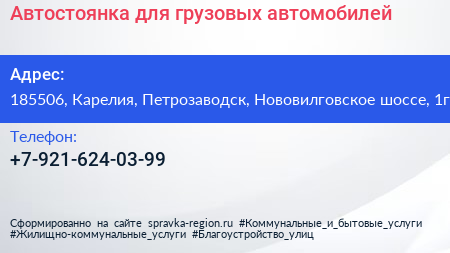 Автостоянка для грузовых автомобилей по адресу 185506, Карелия, Петрозаводск, Нововилговское шоссе, 1г в дальнейшем Организация, размещена в следующих категориях: