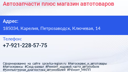 Автозапчасти плюс, магазин автотоваров по адресу 185034, Карелия, Петрозаводск, Ключевая, 14 в дальнейшем Организация, размещена в следующих категориях: