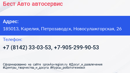 Бест-Авто, автосервис по адресу 185013, Карелия, Петрозаводск, Новосулажгорская, 26 в дальнейшем Организация, размещена в следующих категориях: