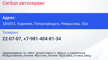 CarSun, автосервис по адресу 185011, Карелия, Петрозаводск, Некрасова, 10а в дальнейшем Организация, размещена в следующих категориях:
