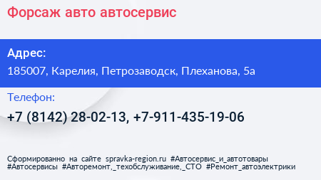 Форсаж авто, автосервис по адресу 185007, Карелия, Петрозаводск, Плеханова, 5а в дальнейшем Организация, размещена в следующих категориях: