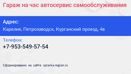 Гараж на час, автосервис самообслуживания по адресу Карелия, Петрозаводск, Курганский проезд, 4в в дальнейшем Организация, размещена в следующих категориях: