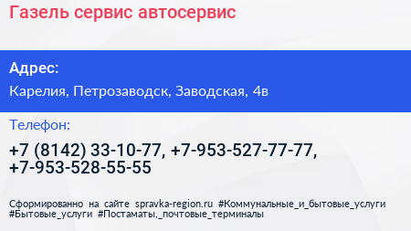 Газель-сервис, автосервис по адресу Карелия, Петрозаводск, Заводская, 4в в дальнейшем Организация, размещена в следующих категориях: