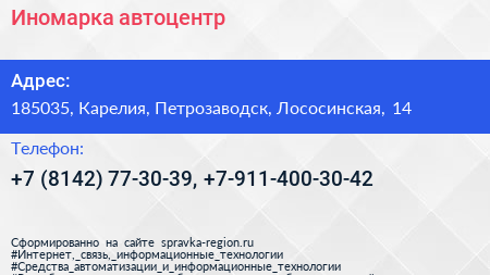 Иномарка, автоцентр по адресу 185035, Карелия, Петрозаводск, Лососинская, 14 в дальнейшем Организация, размещена в следующих категориях: