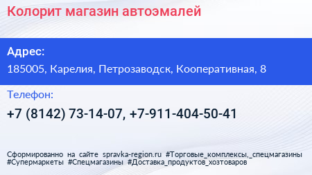 Колорит, магазин автоэмалей по адресу 185005, Карелия, Петрозаводск, Кооперативная, 8 в дальнейшем Организация, размещена в следующих категориях: