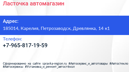Ласточка, автомагазин по адресу 185014, Карелия, Петрозаводск, Древлянка, 14 к1 в дальнейшем Организация, размещена в следующих категориях:
