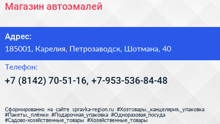 Магазин автоэмалей по адресу 185001, Карелия, Петрозаводск, Шотмана, 40 в дальнейшем Организация, размещена в следующих категориях:
