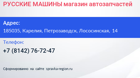 РУССКИЕ МАШИНЫ, магазин автозапчастей по адресу 185035, Карелия, Петрозаводск, Лососинская, 14 в дальнейшем Организация, размещена в следующих категориях: