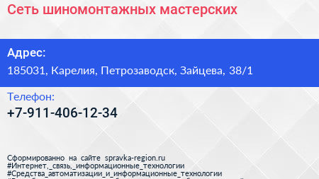 Сеть шиномонтажных мастерских по адресу 185031, Карелия, Петрозаводск, Зайцева, 38/1 в дальнейшем Организация, размещена в следующих категориях: