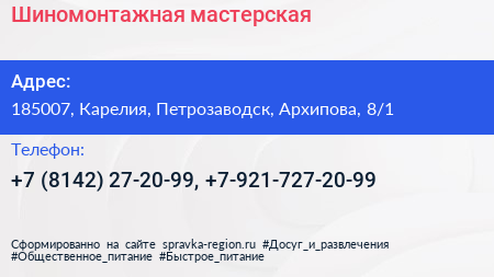Шиномонтажная мастерская по адресу 185007, Карелия, Петрозаводск, Архипова, 8/1 в дальнейшем Организация, размещена в следующих категориях: