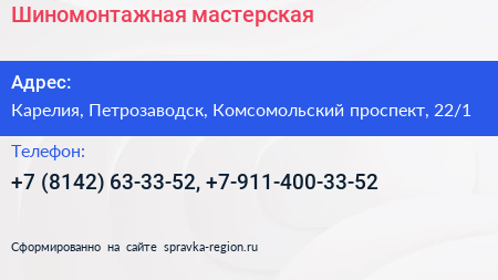 Шиномонтажная мастерская по адресу Карелия, Петрозаводск, Комсомольский проспект, 22/1 в дальнейшем Организация, размещена в следующих категориях: