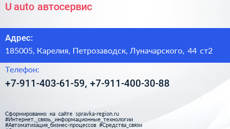 U-auto, автосервис по адресу 185005, Карелия, Петрозаводск, Луначарского, 44 ст2 в дальнейшем Организация, размещена в следующих категориях: