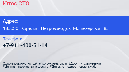 Ютос, СТО по адресу 185030, Карелия, Петрозаводск, Машезерская, 8а в дальнейшем Организация, размещена в следующих категориях: