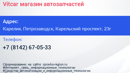 Vitcar, магазин автозапчастей по адресу Карелия, Петрозаводск, Карельский проспект, 23г в дальнейшем Организация, размещена в следующих категориях: