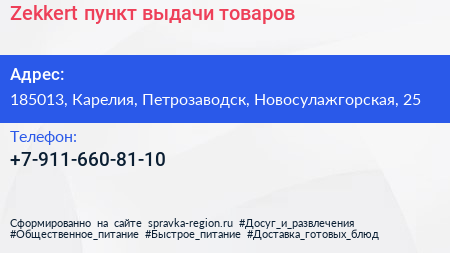 Zekkert, пункт выдачи товаров по адресу 185013, Карелия, Петрозаводск, Новосулажгорская, 25 в дальнейшем Организация, размещена в следующих категориях: