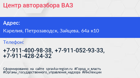 Центр авторазбора ВАЗ по адресу Карелия, Петрозаводск, Зайцева, 64а к10 в дальнейшем Организация, размещена в следующих категориях: