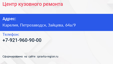 Центр кузовного ремонта по адресу Карелия, Петрозаводск, Зайцева, 64а/9 в дальнейшем Организация, размещена в следующих категориях: