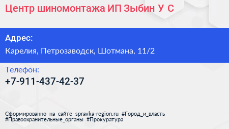 Центр шиномонтажа, ИП Зыбин У.С. по адресу Карелия, Петрозаводск, Шотмана, 11/2 в дальнейшем Организация, размещена в следующих категориях: