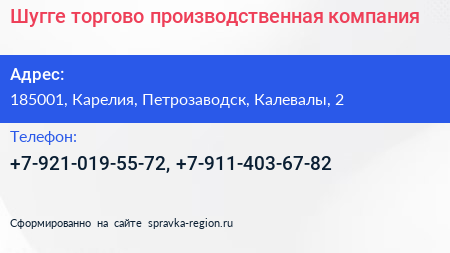 Шугге, торгово-производственная компания по адресу 185001, Карелия, Петрозаводск, Калевалы, 2 в дальнейшем Организация, размещена в следующих категориях: