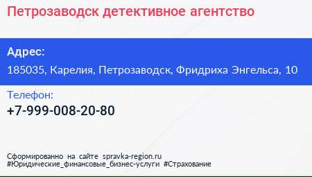 Петрозаводск, детективное агентство по адресу 185035, Карелия, Петрозаводск, Фридриха Энгельса, 10 в дальнейшем Организация, размещена в следующих категориях: