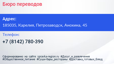 Бюро переводов по адресу 185035, Карелия, Петрозаводск, Анохина, 45 в дальнейшем Организация, размещена в следующих категориях: