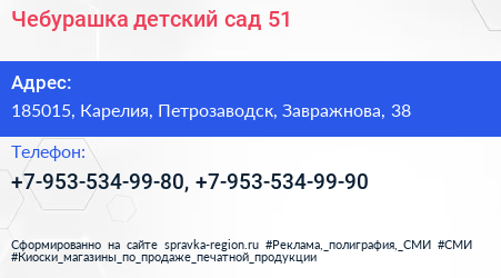 Чебурашка, детский сад №51 по адресу 185015, Карелия, Петрозаводск, Завражнова, 38 в дальнейшем Организация, размещена в следующих категориях: