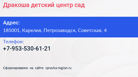 Дракоша, детский центр-сад по адресу 185001, Карелия, Петрозаводск, Советская, 4 в дальнейшем Организация, размещена в следующих категориях: