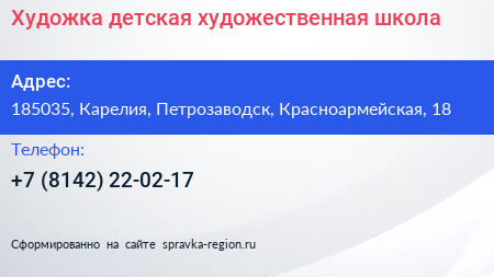 Художка, детская художественная школа по адресу 185035, Карелия, Петрозаводск, Красноармейская, 18 в дальнейшем Организация, размещена в следующих категориях: