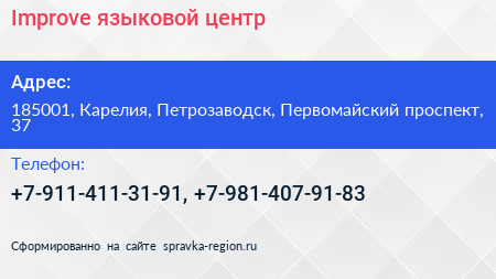 Improve, языковой центр по адресу 185001, Карелия, Петрозаводск, Первомайский проспект, 37 в дальнейшем Организация, размещена в следующих категориях: