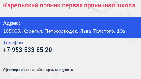 Карельский пряник, первая пряничная школа по адресу 185005, Карелия, Петрозаводск, Льва Толстого, 10а в дальнейшем Организация, размещена в следующих категориях: