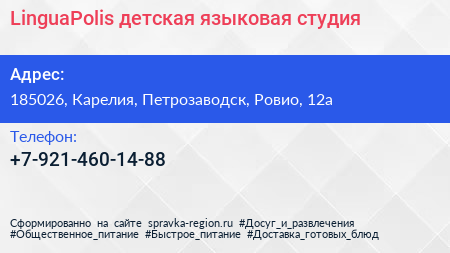 LinguaPolis, детская языковая студия по адресу 185026, Карелия, Петрозаводск, Ровио, 12а в дальнейшем Организация, размещена в следующих категориях: