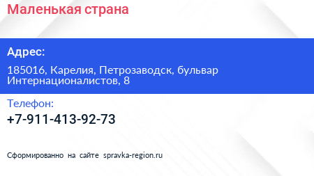 Маленькая страна по адресу 185016, Карелия, Петрозаводск, бульвар Интернационалистов, 8 в дальнейшем Организация, размещена в следующих категориях: