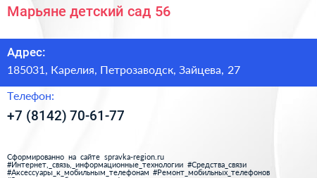 Марьяне, детский сад №56 по адресу 185031, Карелия, Петрозаводск, Зайцева, 27 в дальнейшем Организация, размещена в следующих категориях:
